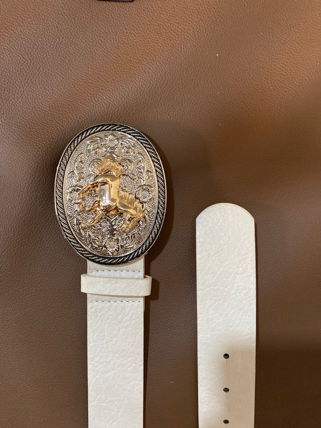 Cinto de Couro Cowboy Branco com Fivela Oval Cavalo