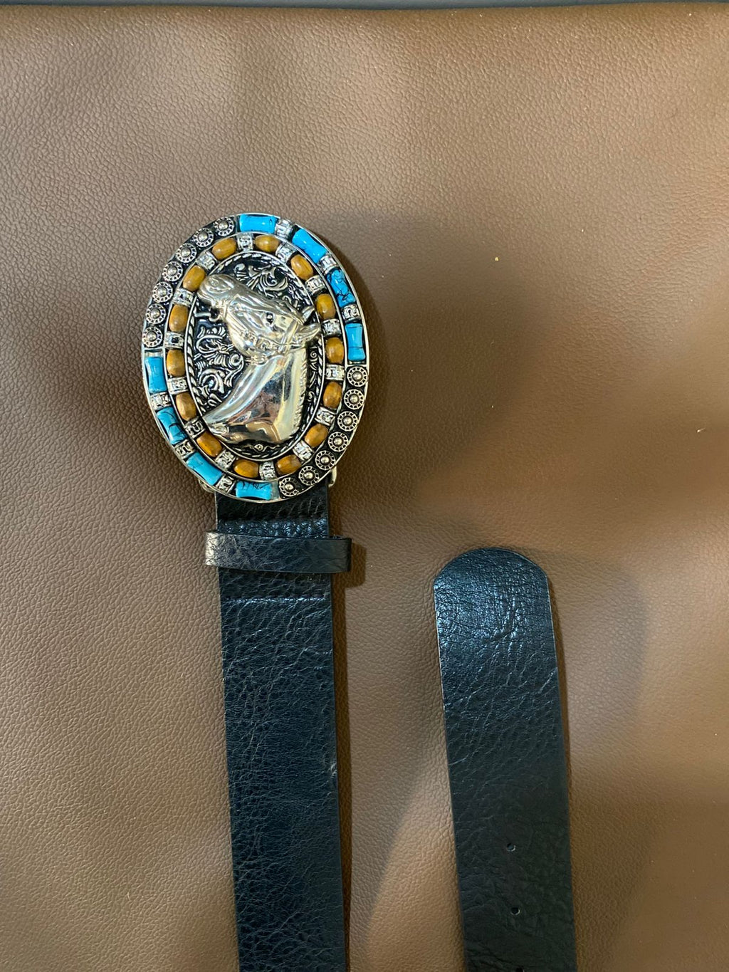 • Detalhes: Fivela oval prateada com a figura de um touro, cercada por pedrarias turquesa e douradas.
