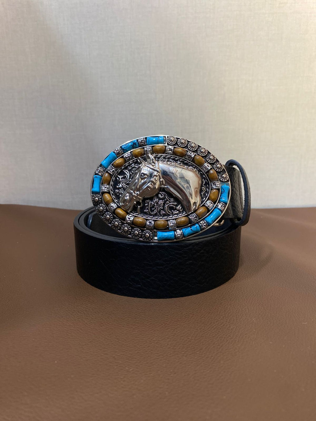 Cinto de Couro C/ Fivela de Cavalo e Pedraria